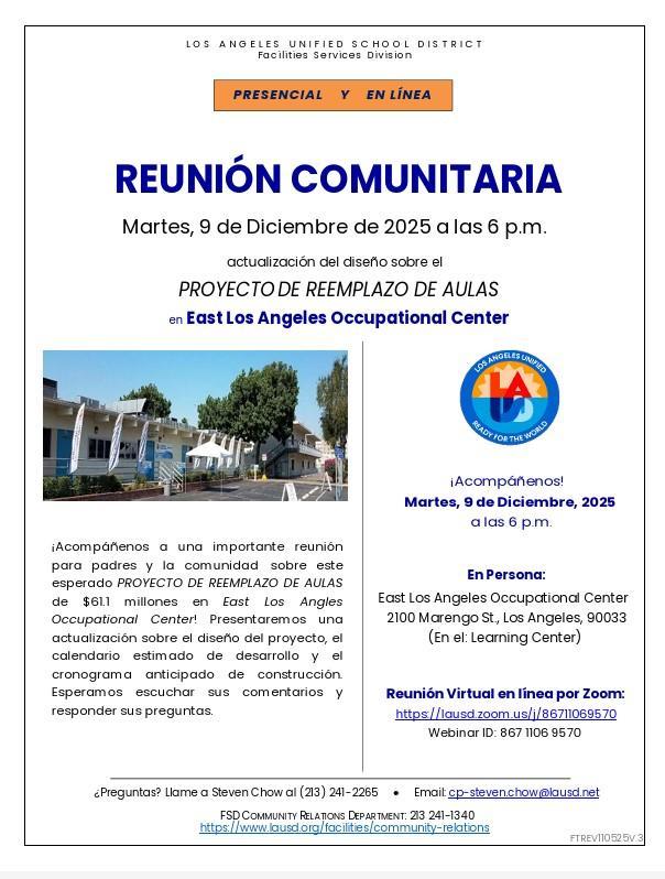 ELAOC Classroom Replacement Project - Community Meeting 12/9 https://lausd.zoom.us/j/86711069570 Webinar ID: 867 1106 9570 Attached Files Notice - Classroom Replacement Project Design Update Mtg - ELAOC (1).pdf